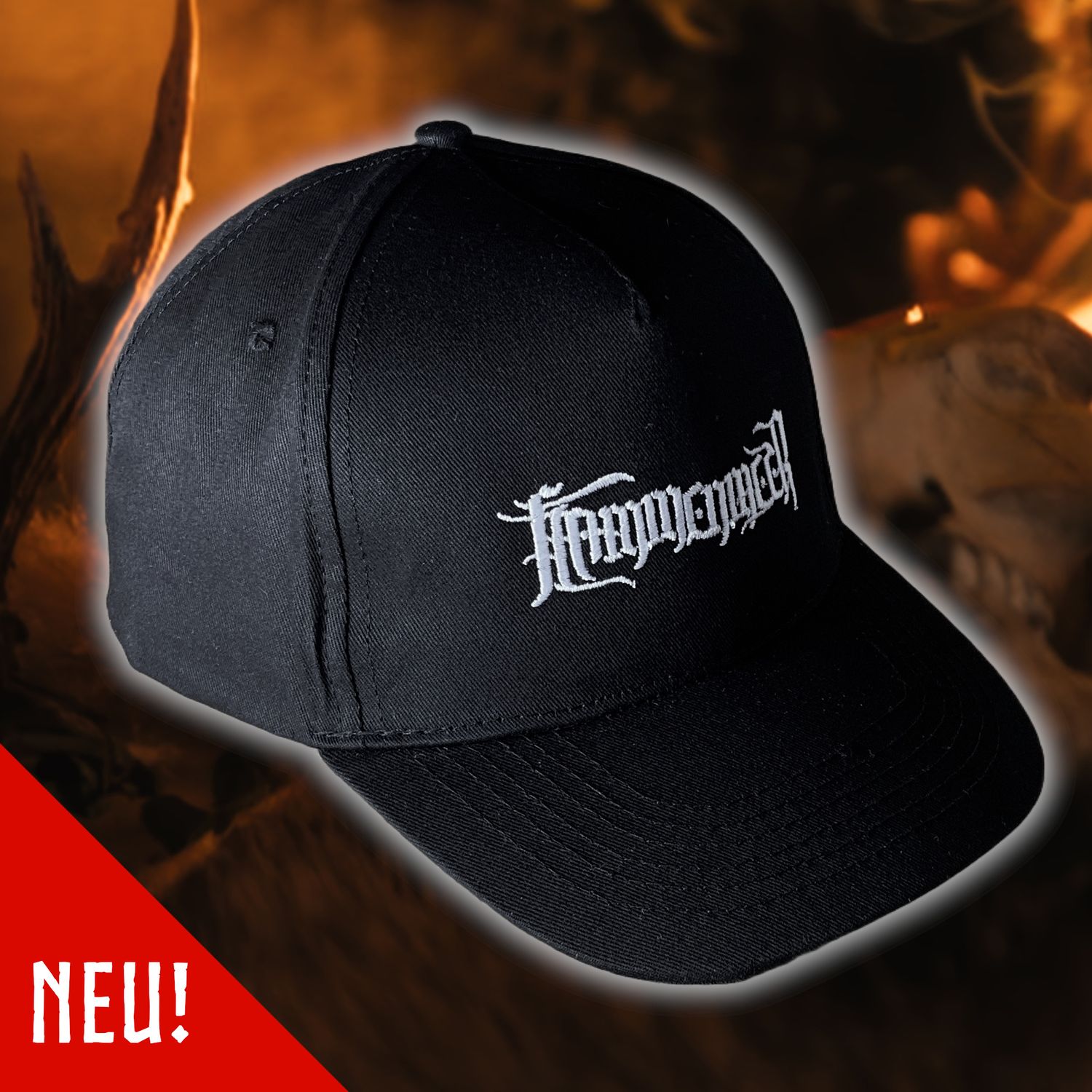 Endlich haben wir neuen Merch für euch: Eine klassische, schwarze Baseballcap „Basic Twill“, vorne bestickt mit dem Flammenmeer-Schriftzug.